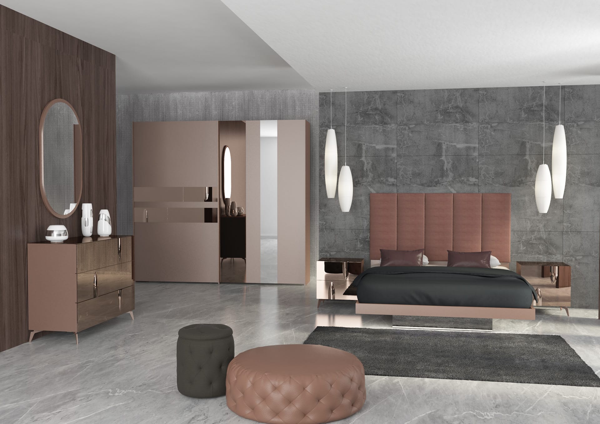 In alto: struttura bronzo laccato e specchi sagomati a caldo bronzati, letto Fly con basamento a specchio, armadio 2 ante scorrevole con ante laccate bronzo e specchi bronzati