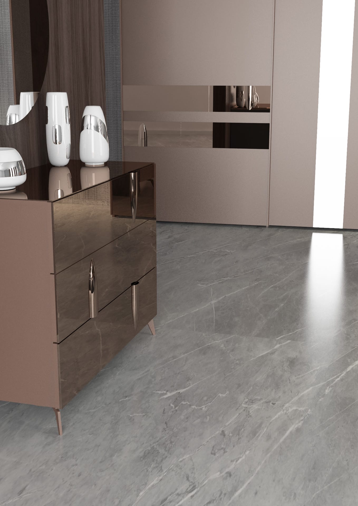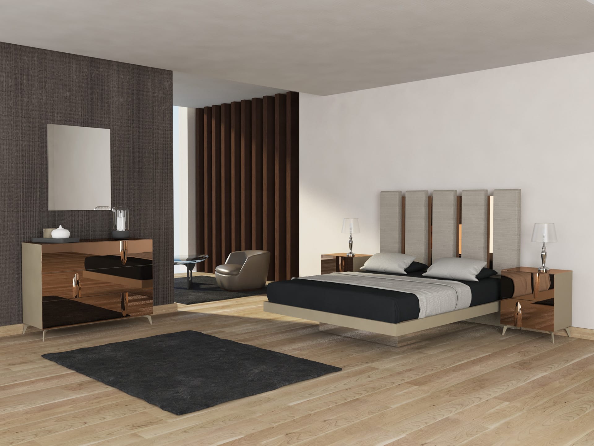 Il bronzo laccato disegna volumi essenziali e avvolgenti, mentre lo specchio bronzato accende la stanza di bagliori intensi e sfumati.