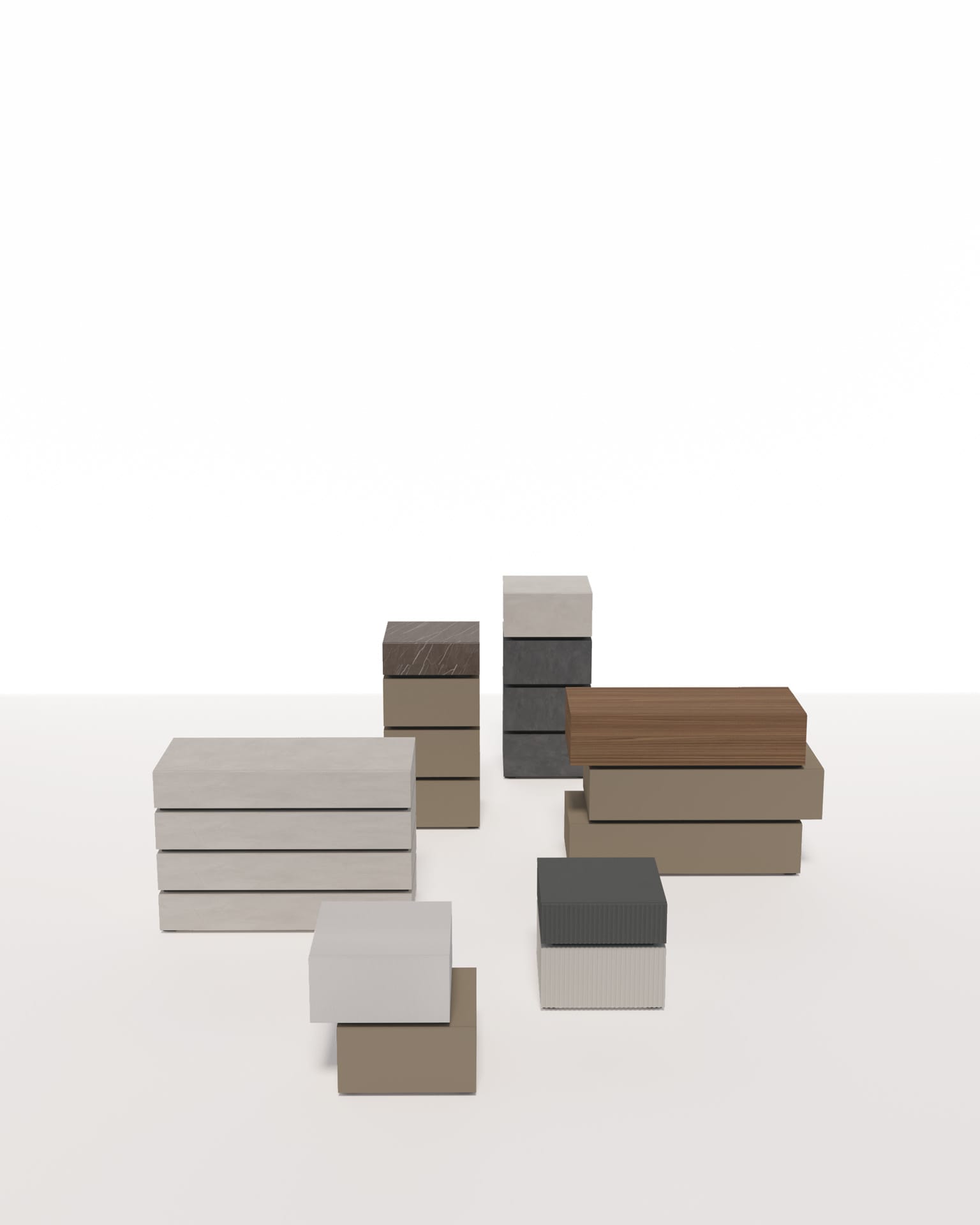 Essenze materiche o impiallacciate, anche in eleganti versioni cannettate, si alternano a laccati in una palette che spazia dai toni più delicati e naturali alle sfumature intense e contemporanee. Ogni combinazione è un gioco di equilibri: luce e ombra, opaco e lucido, neutro e vivace.