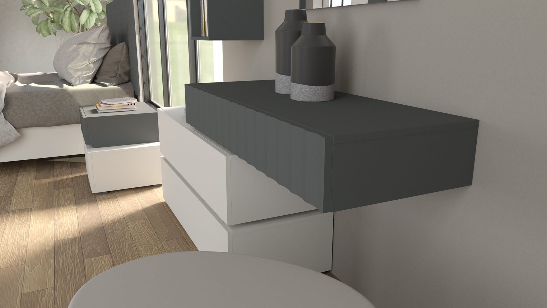 Il legno non domina, ma accompagna; non impone, ma arricchisce. È la nota calda che rende unico l’insieme, trasformando la purezza del colore in un racconto fatto di sfumature e tattilità.