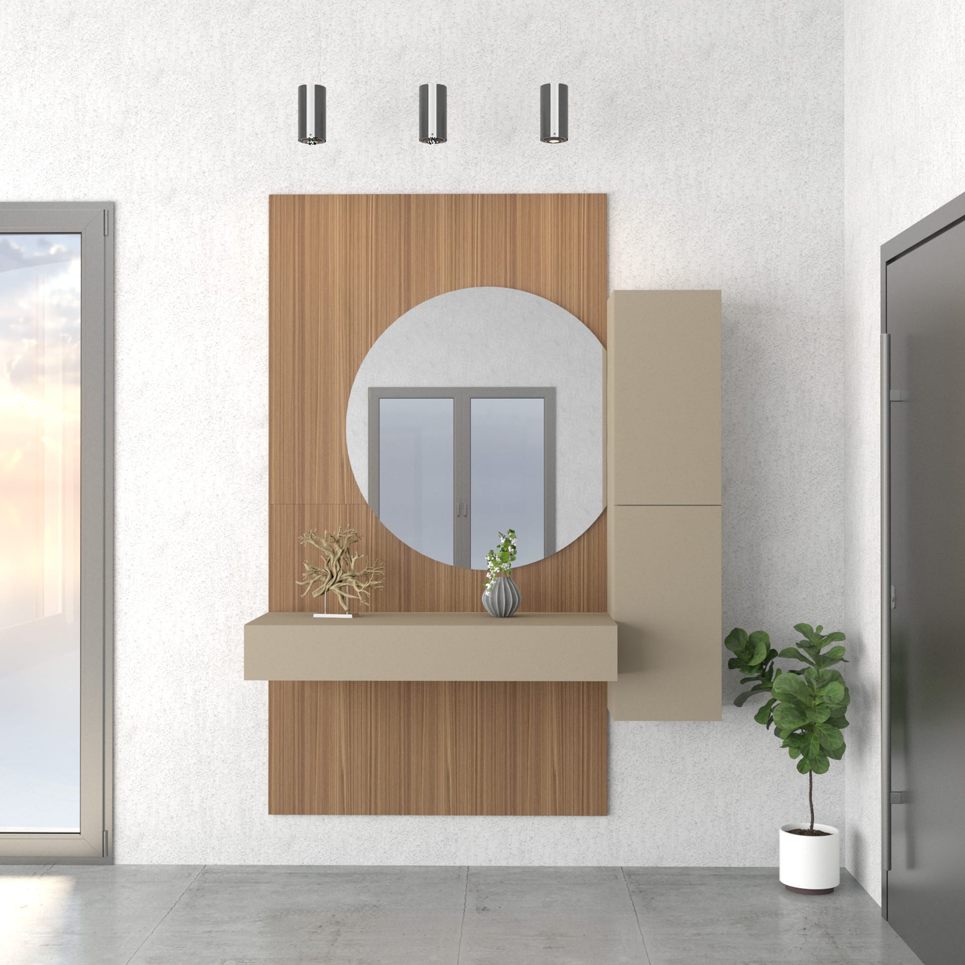 Il Noce Chiaro riveste la parete con un calore continuo e avvolgente. La specchiera “Round” diventa punto focale, aprendo la soglia con luce e prospettiva. Il Visone accompagna con sobrietà, lasciando che l’ingresso si trasformi in un gesto accogliente e intimo.