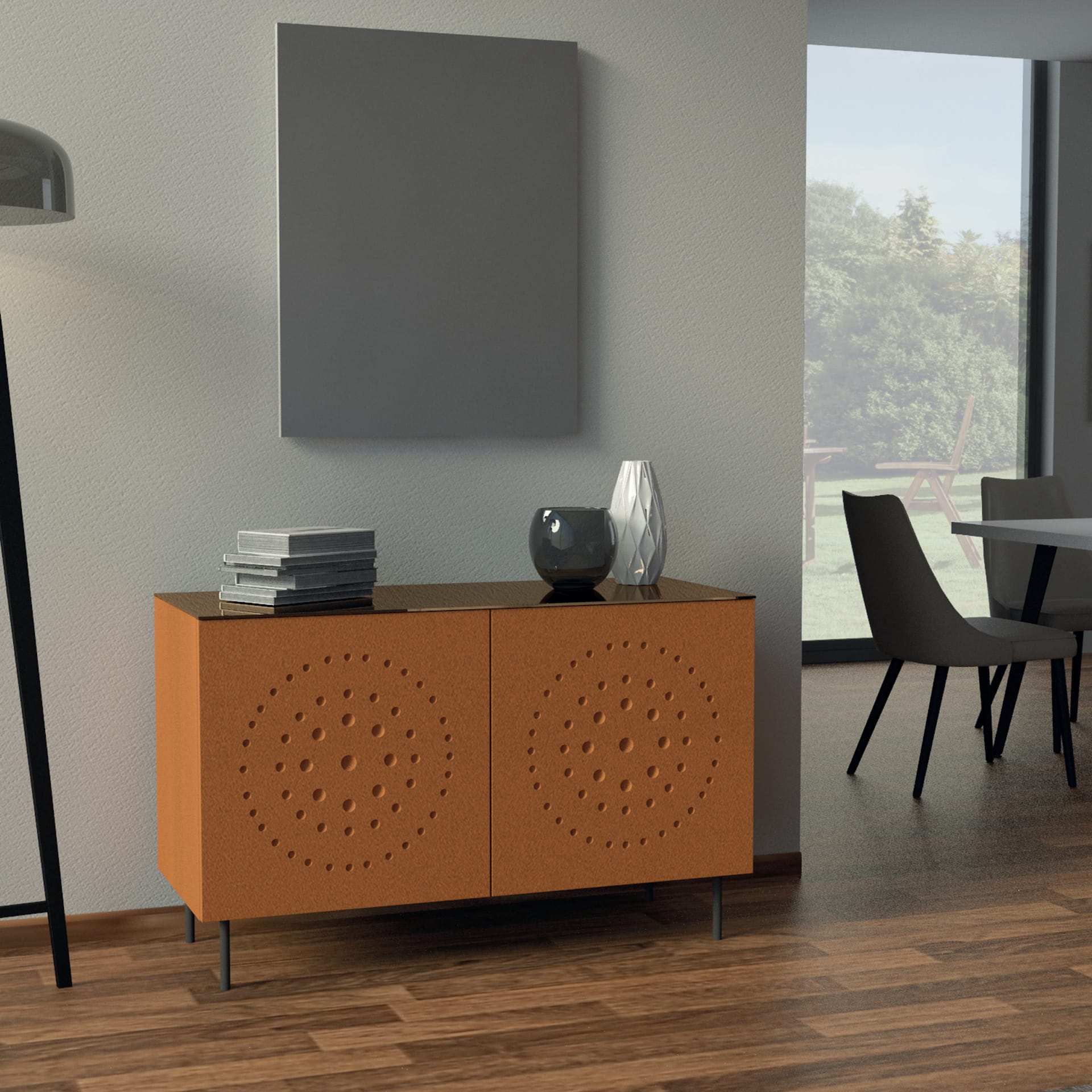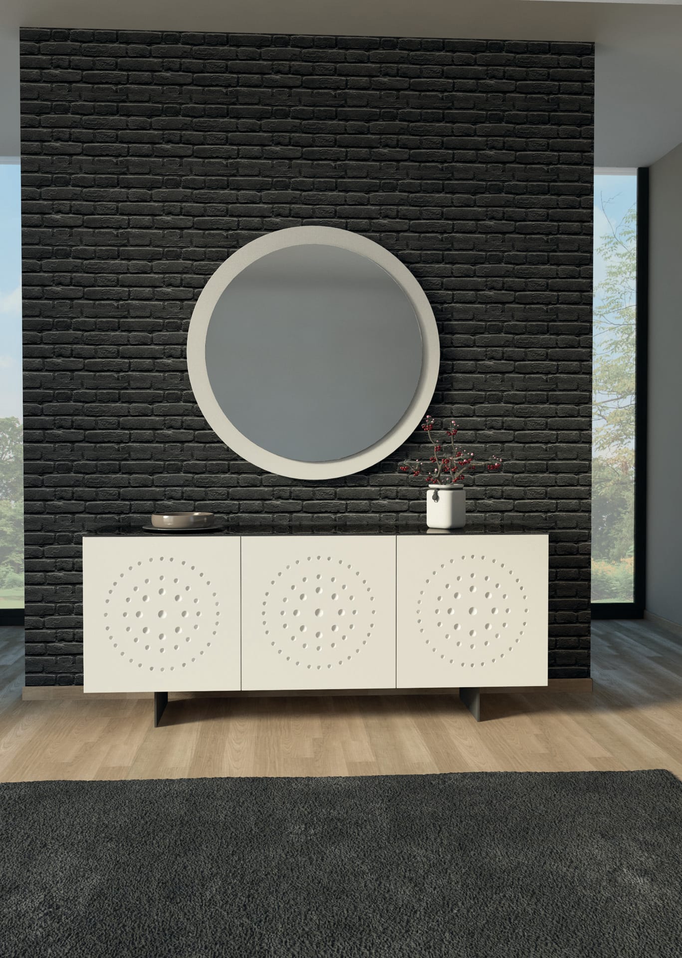 Sulle ante, rilievi che emergono come impronte sottili, creando giochi di chiaroscuri misurati.