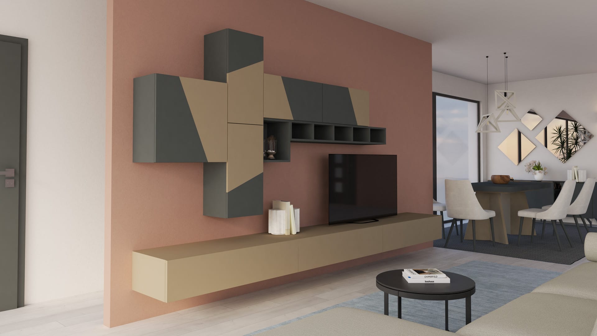 Il Visone e l’Antracite si sfiorano come ombra e luce, creando una tensione delicata che vibra sulla parete. I volumi sospesi amplificano la leggerezza, trasformando la composizione in un gesto misurato di eleganza quotidiana.