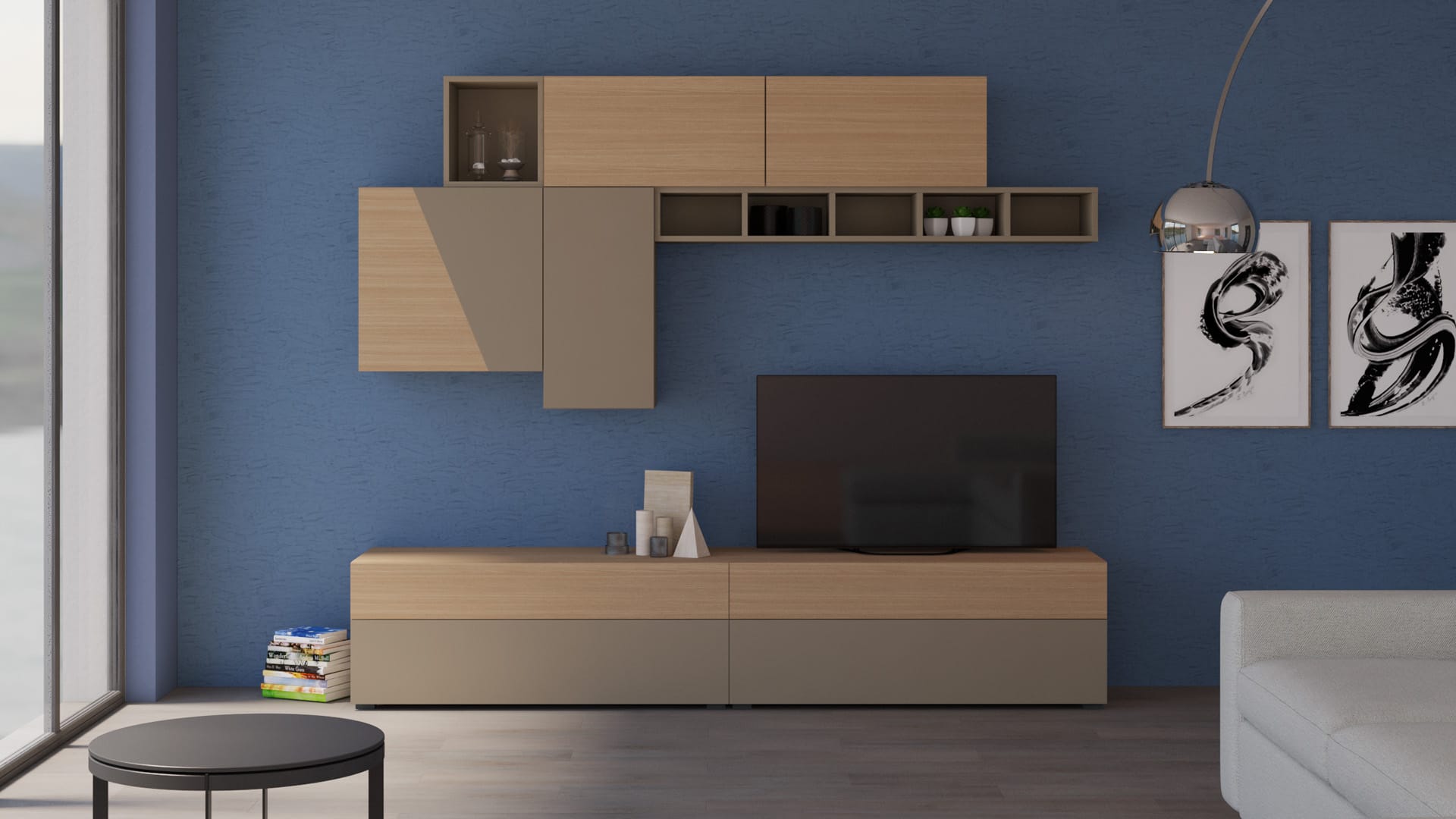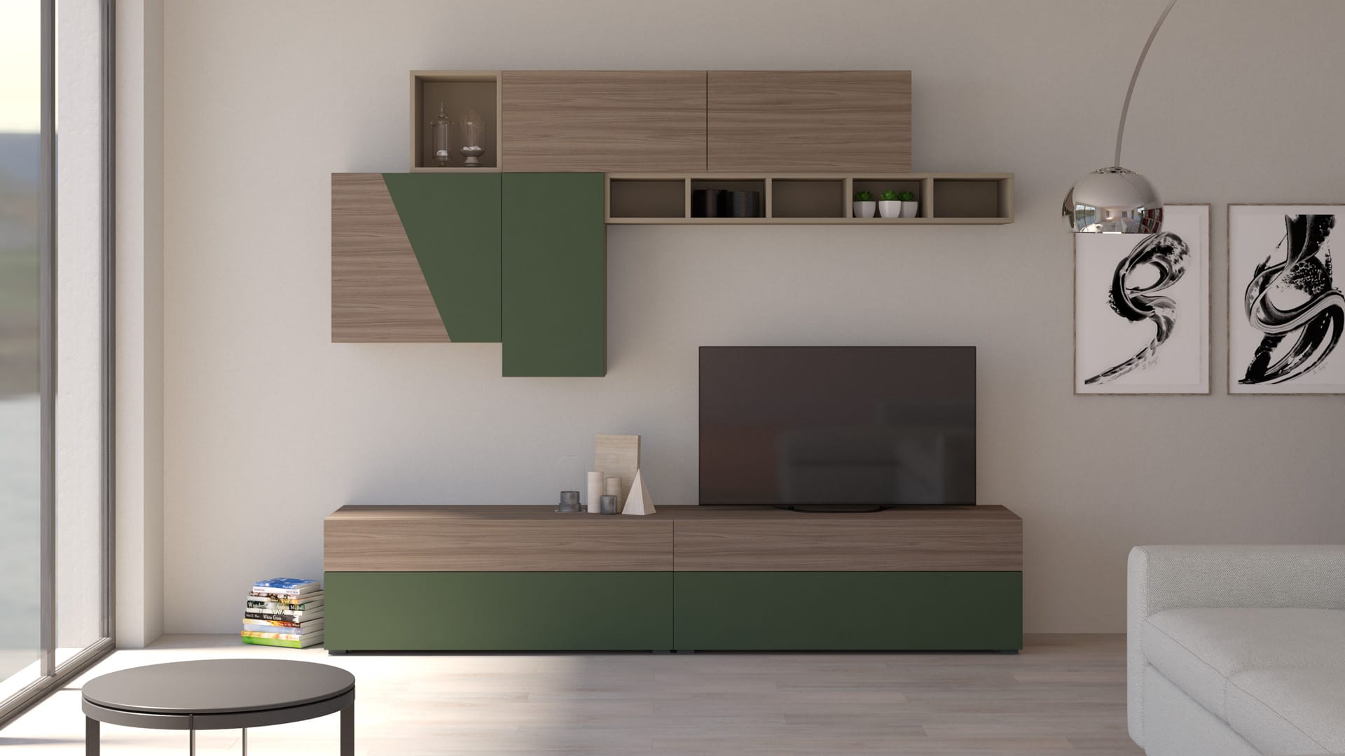 Il Verde Zeus irrompe sulla superficie in Noce Tabacco, creando un contrasto deciso e vibrante. Le venature del legno dialogano con la laccatura intensa, mentre i volumi sospesi si distribuiscono con misura. Una parete che unisce forza naturale ed energia cromatica, trasformando il soggiorno in uno spazio vitale e accogliente.