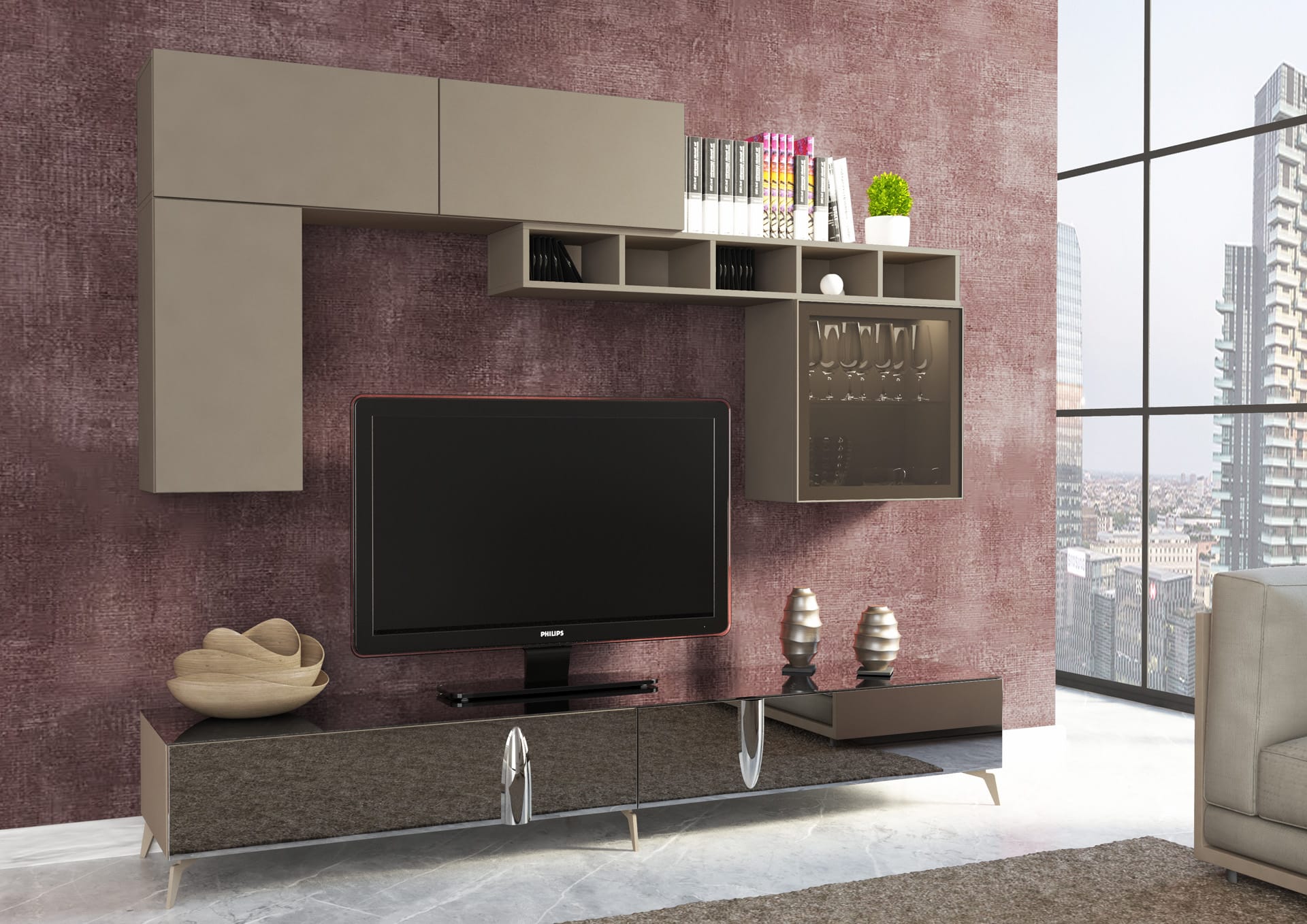Specchi fumé e superfici in Visone si intrecciano come velature leggere, moltiplicando riflessi e profondità. I piedi in metallo accompagnano lo sguardo con discrezione poetica, trasformando la parete in un gioco raffinato di intimità e luce.