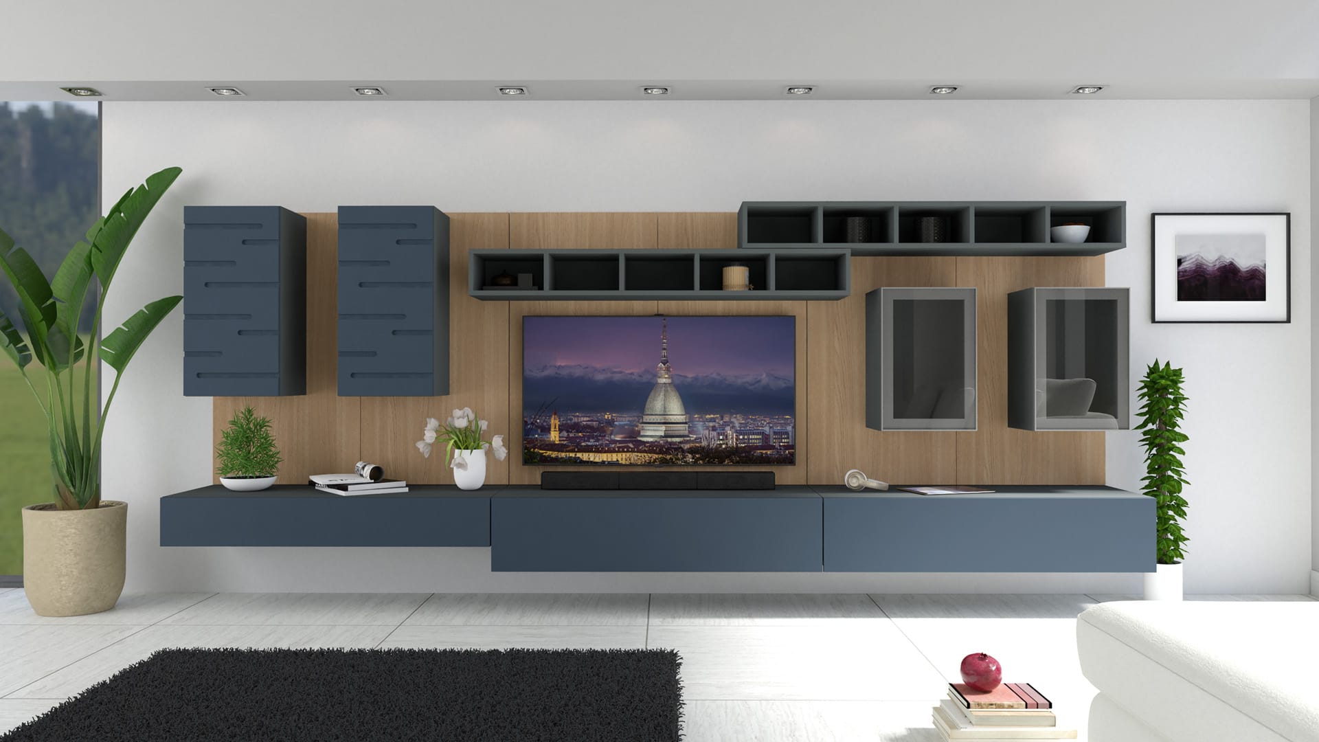 Un soffio di Blu Notte opaco danza sulla parete, catturando e restituendo la luce come una carezza liquida. I pensili in vetro fumé dissolvono i confini, sospesi in una dissolvenza di materia e aria. La boiserie in Noce Tabacco regala un respiro caldo e lento, completando una parete che pulsa di matericità e consapevolezza.