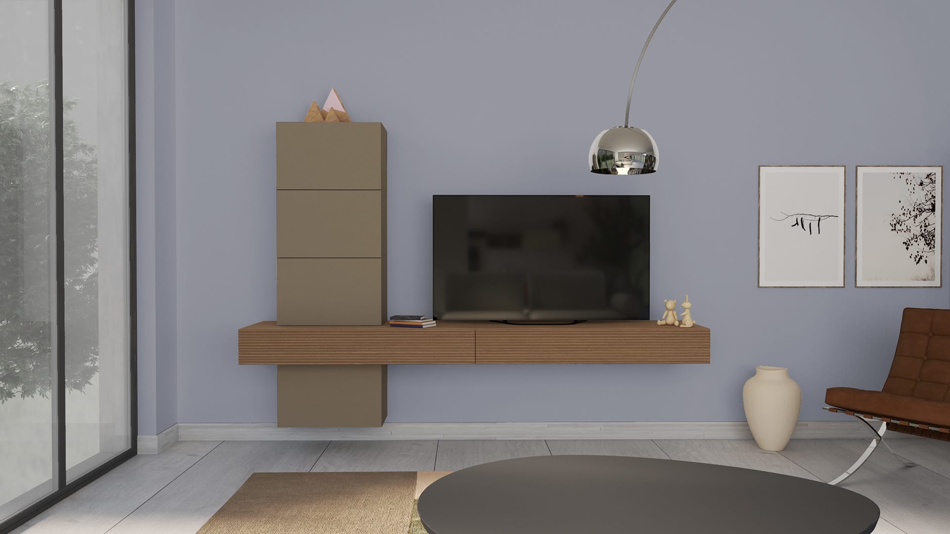 Visone e Noce Cannettato intrecciano le loro texture in un gioco di superfici vellutate e profonde. I moduli sospesi si muovono con leggerezza, trasformando la parete in un organismo vivo che respira intimità. Un sistema che parla al tatto prima ancora che alla vista.