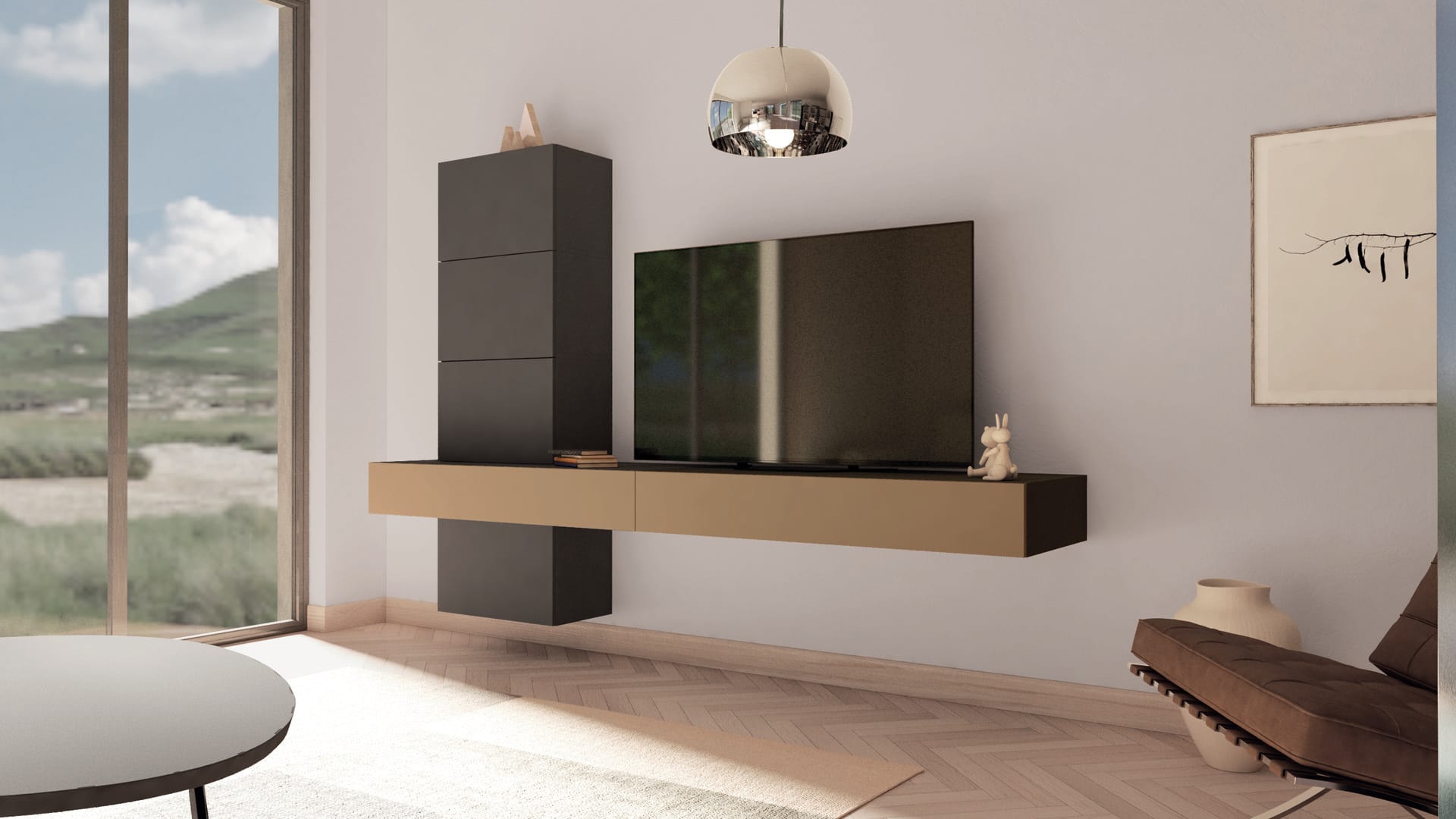 Sul fondale scuro dell’Antracite si distende la morbidezza del Visone, dando vita a un equilibrio intimo e raffinato. Gli elementi sospesi sembrano librarsi come note leggere, creando una melodia visiva fatta di ordine e respiro.