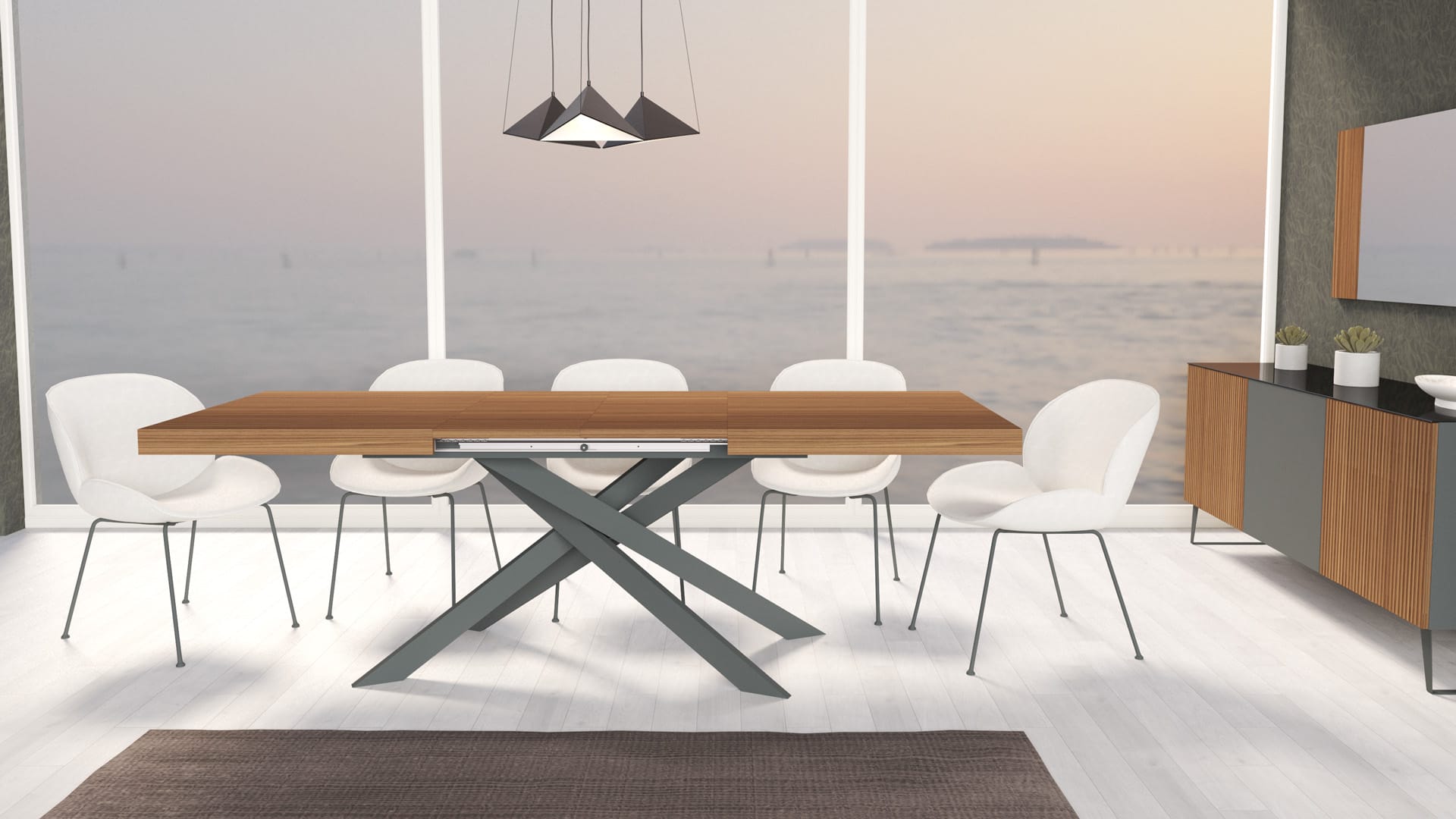 Lo spazio sottopiano custodisce le prolunghe con discrezione e offre un supporto pratico per gli accessori della tavola. Il supporto in acciaio laccato antracite rafforza l’essenzialità della struttura. X un tavolo versatile, pensato per chi cerca ordine ed efficienza.